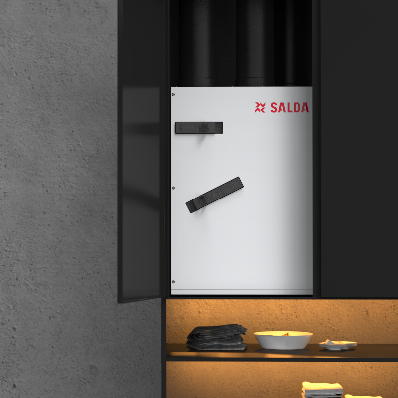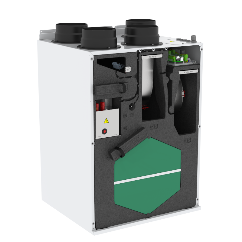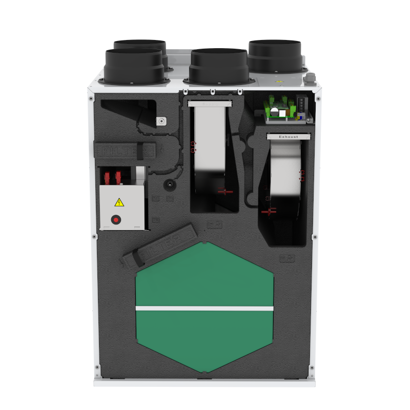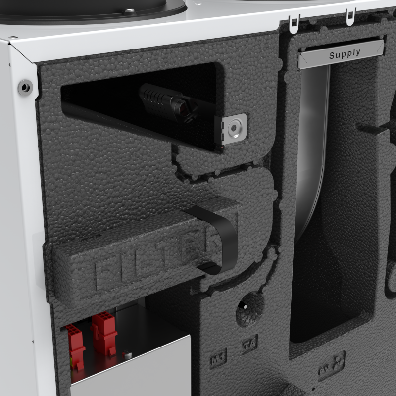 Das luftdichte Gehäuse aus EPP minimiert Leckagen im Innen- und Außenbereich. Die Luftdichtheit wird in der Produktion geprüft, um sicherzustellen, dass keine Gerüche aus der abgesaugten Luft in die Räumlichkeiten gelangen. Dank der EPP-Isolierung wiegt das Gerät nur 42 -44kg (je nach Version), was die Installation erleichtert.