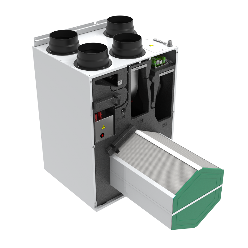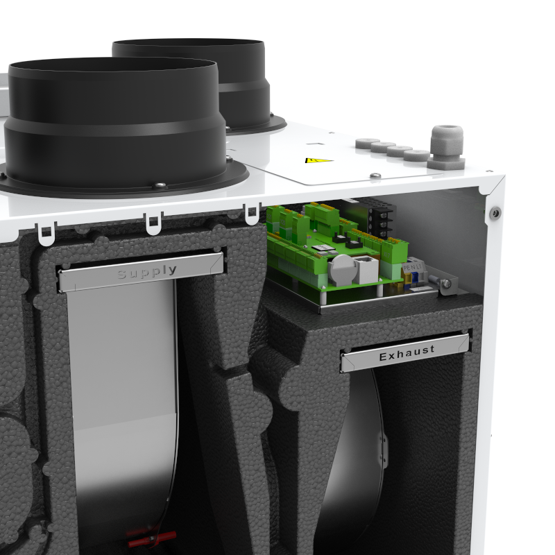 - Ein effizienter Gegenstromwärmetauscher aus Kunststoff erreicht laut Ecodesing-Berechnungen eine Wärmerückgewinnungsrate von 89 %. EC-Ventilatoren verbrauchen lediglich 0,272 W/(m³/h).